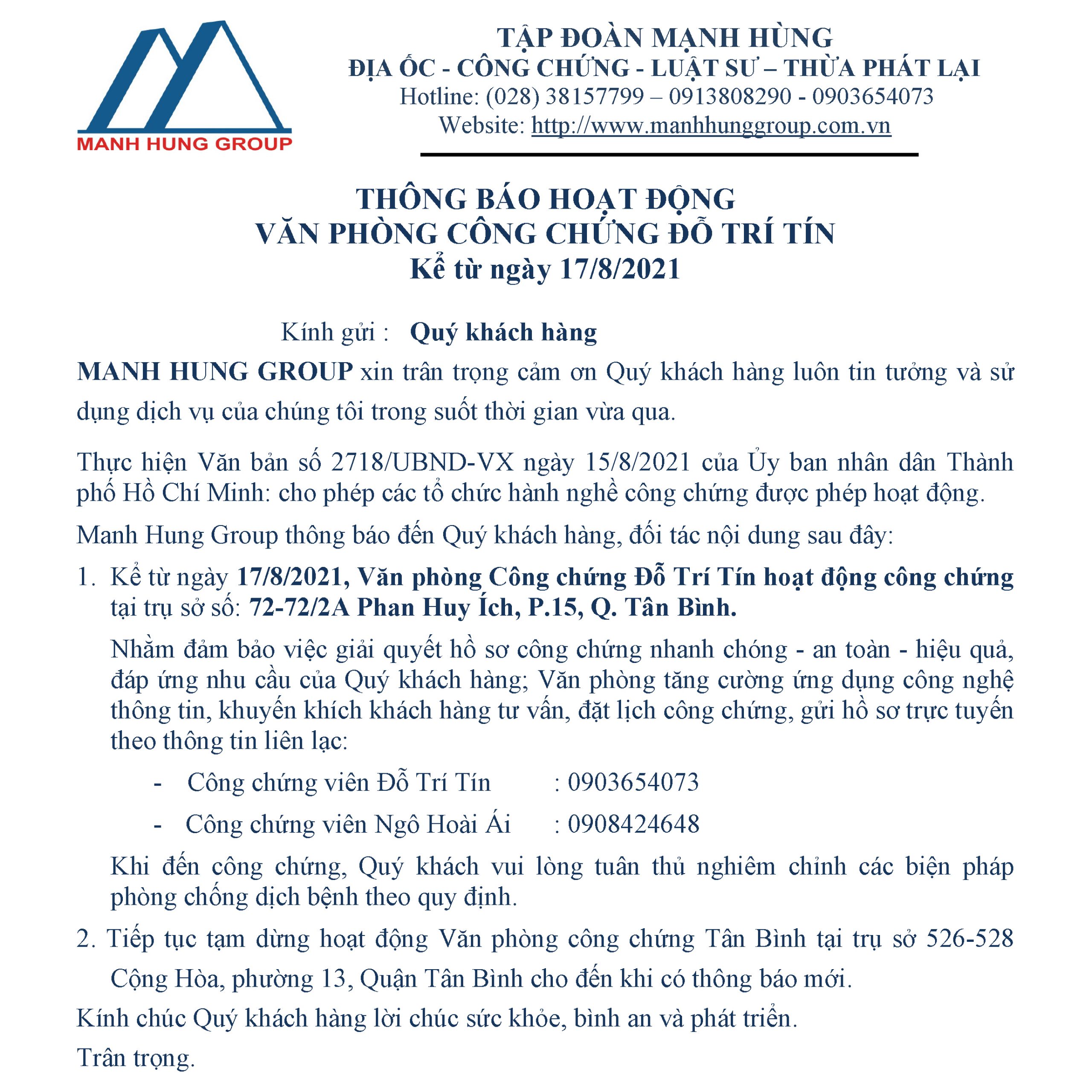 MANH HUNG GROUP THÔNG BÁO HOẠT ĐỘNG KỂ TỪ NGÀY 17.8.2021